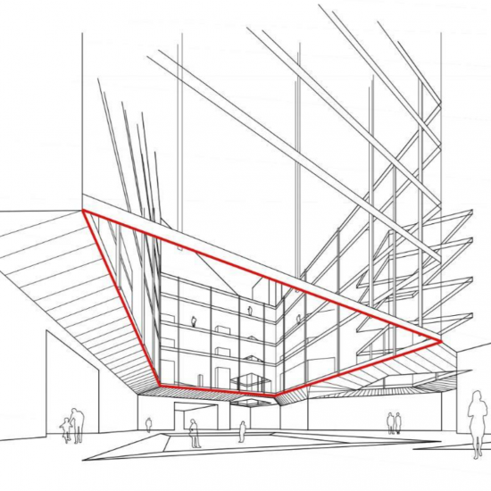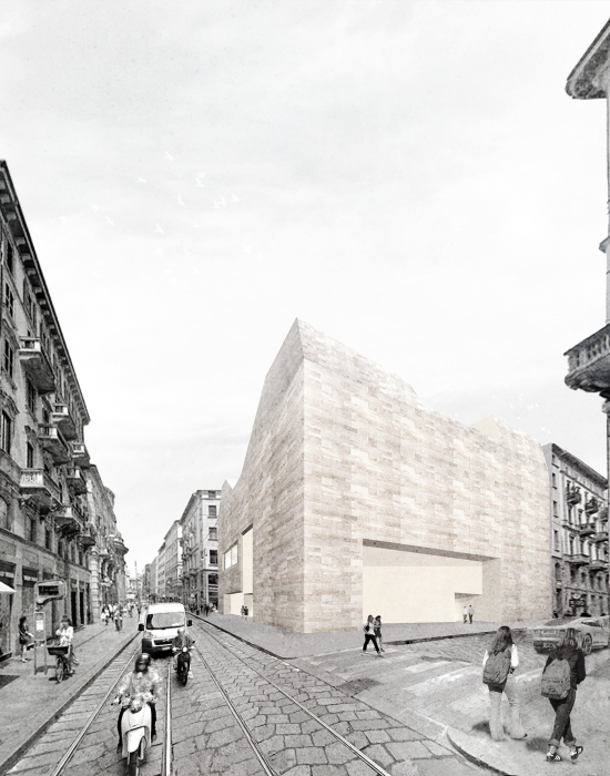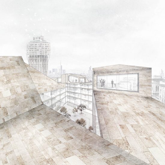 El aspecto pétreo y jerarquizado de la fachada exterior contrasta con el aspecto moderno de las fachadas interiores de vidrio. Además se completa el volumen en su parte superior con unos salientes tallados y unas terrazas públicas en relación a las torres de la ciudad de Milán.