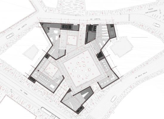 Propuesta de concurso para la firma de mobiliario Driade y su nueva sede en Milán. El emplazamiento dentro del casco histórico de la ciudad y rodeado de edificios emblemáticos hace que la propuesta se centre en crear una manzana compacta con patios interiores creando un volumen macizo completo al exterior y unos espacios interiores luminosos volcados a los 3 varios interiores.