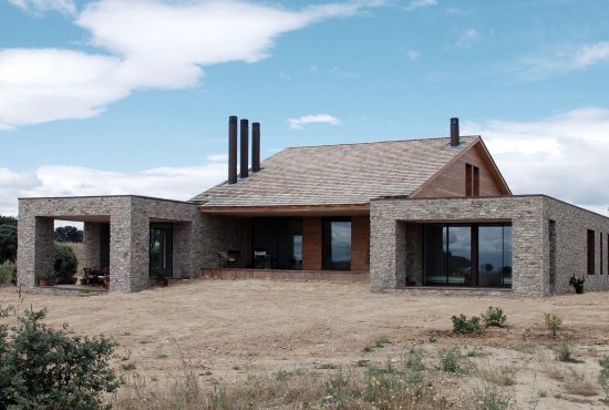 Vivienda con una clara volumetría, que con su sencillez compositiva y con materiales como la teja cerámica y la madera, se integra sin estridencias en el paisaje natural.